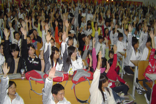 接着,他举了很多鲜活的例子,用事实告诉我们,口语才是最重要的,只要你能讲的出来的话就一定能听的懂。进入到社会里,没有人去用选择题去考察你英语好坏。只有你真正能用英语和人交流,别人才会承认你的英语价值,你才会有机会获得成功。接着介绍了“三最”说英语、“一口气” 说英语,“五腔并用” 说英语等实用的提高英语口语能力的疯狂而又独特的方法,这让同学们认识到了以前学习口语英语的误区。而且他也讲了怎样背单词,不要单纯为了背而背。而是用句子背单词,用文章背单词,并随身带纸条。最后,学习英语要不怕丢脸,要随时随地的卖弄,这才能培养自己对英语的信心。