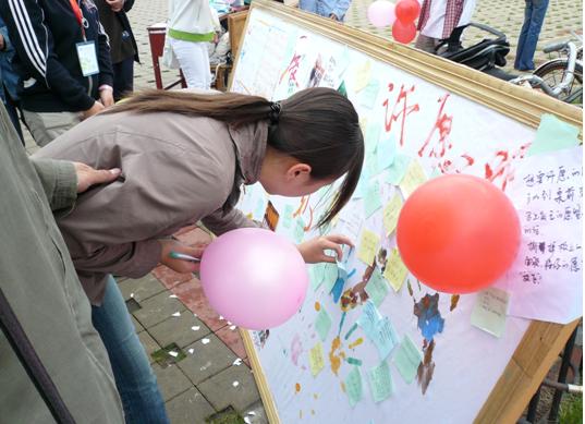 5月25日,上午10点许,灰暗的天空,霏霏细雨,当大多数的同学脸上还挂着几分踌躇,几分苦闷的时候。心理咨询中心的老师和我们全体阳光心愿心理健康学社的社员怀着明朗的心情在新区食堂门口进行现场咨询活动,以“我爱我——分享阳光·放飞心苑”为主题的活动,旨在维护学生心理健康,驱除内心阴霾,让其内心充满阳光,此次活动,三位有着多年心理咨询经验的老师现场解答了多位同学内心的困惑、疑虑。老师们还现场解除了很多学生关于心理咨询错误的想法,并不是心理有问题的人才进行心理咨询,而是我们要通过这次“5.25”活动,宣传一些心理常识,更好的应对各方面的烦恼和压力,同时,还现场传送一些减压、缓解痛苦、调节情绪的方法。那边食堂饭香,这边风景独好,现场的娱乐互动活动,不因阴雨而灰暗,“情绪爆破”吹出你的坏心情,让惆怅匍匐在你的脚下,一声爆破你将是一个快乐的人,一个个气球承载着你难以梳理的情绪,在脚下红的、绿的、黄的……之后,一阵阵银铃般的笑声,心中便升起了七彩的快乐。“许愿吧”许下一个美好的愿望,让大家共同祝愿梦想成真,也许有一个愿望一直培植在你心中伴你成长,也许有一个梦想一直流淌在你血液中催你奋进……花开两岸分外香,把你的愿望、梦想折成千纸鹤让它伴着阳光、随着心愿一同飞翔,让大家一起默默祈祷。