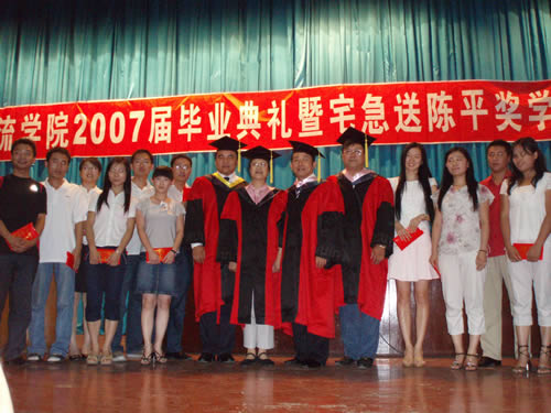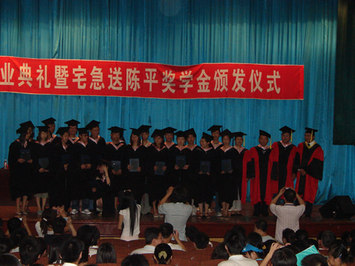 在陈平董事长发表热情而感人的演讲之后,宅急送领导与学校与会领导为获得2007年宅急送陈平奖学金学生颁奖、为优秀毕业生代表扶正流苏、颁发毕业证书和学位证书。