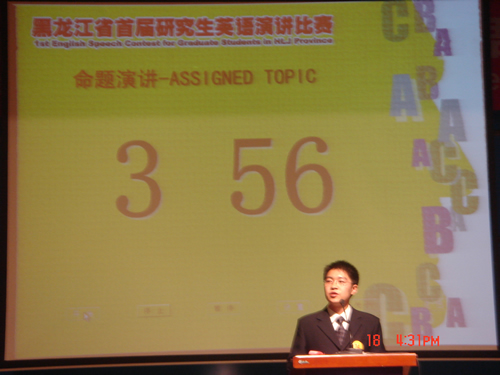本届研究生英语演讲比赛是由黑龙江省学位办、黑龙江省学位与研究生教育学会主办的省内首次大规模的研究生英语大赛。大赛的举办受到了省内各高校的高度重视,共有23所高校选手参赛。在省决赛前,我校研究生处在校内组织了我校首届研究生英语演讲比赛,通过命题演讲,即兴演讲,现场问答三个环节,考察选手的语言应用能力和临场应变技巧。张世明同学在学校比赛中获得冠军,并代表学校参加决赛。