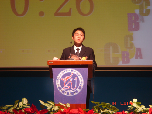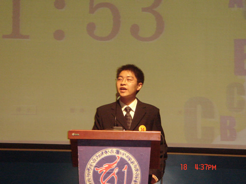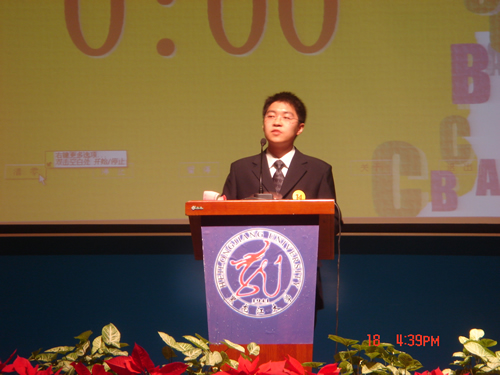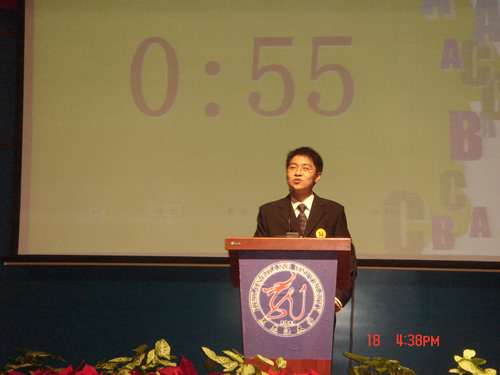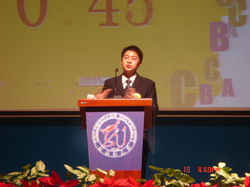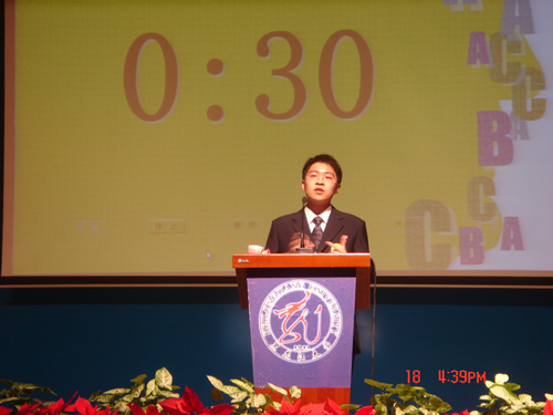 这是我校研究生首次代表学校参加高水平英文演讲比赛,得到了学校领导和研究生处的高度重视,研究生处副处长陶萍老师带队参赛。在比赛的过程中,张世明同学以流利的口语表达、地道的英语用词向在场的评委和观众展示了我校大学生的风采,受到评委的一致好评。张世明同学本科期间就读于我校,在校期间曾多次代表学校参加国家级英语类比赛并获奖,曾于2002年、2003年获“CCTV杯全国大学生英语演讲比赛”省三等奖、二等奖;“外教社杯全国大学生英语写作比赛”一等奖;中国·新加坡道琼斯之旅财经英语翻译大赛优胜奖。在这次比赛的准备过程中我校外语学院的匡忱老师投入了许多精力和时间对张世明同学给予指导。