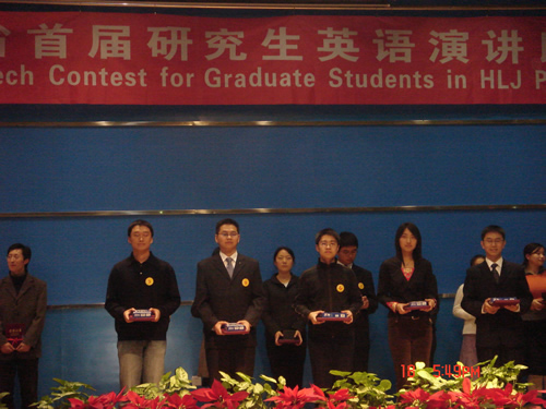 黑龙江省首届研究生英语演讲比赛于2006年10月18日在黑龙江大学举行,我校06级行政管理专业研究生张世明同学在比赛中取得骄人成绩,获得亚军;我校获得优秀组织奖;外语学院匡忱老师获得优秀指导教师奖。