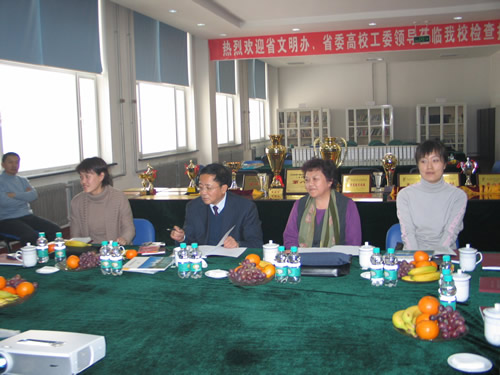 刘书记首先介绍了近两年来学校发展的概况,重点从制定规划,切实加强组织领导;统一思想,增强群体创建意识;突出重点,加强领导班子建设;强化教育,加强思想政治建设;加强党建,充分发挥“两个作用”;依法治校,不断提高学校民主管理水平;加大投入,改善办学条件;创新载体,在文明创建实效上下功夫等八个方面详细汇报了我校在创建省级文明单位标兵过程中所做的主要工作。随后刘书记分析了两年来我校文明创建工作所取得的主要成效,包括办学理念日趋成熟;党建和思想政治工作成绩斐然;学科建设取得历史性突破;本科教学工作水平评估取得丰硕成果;教学、科研水平显著提升;师资队伍质量稳步提高