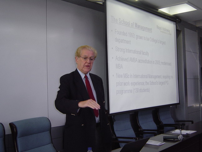 2006年10月19日,应国际合作处邀请,英国皇家霍洛威大学MBA中心主任大卫·福克尔教授和国际合作处安东尼克·特克女士一行2人,来我校访问并举办了《英国MBA教育及皇家霍洛威大学介绍》的讲座,MBA部分学员及工商管理学院的部分学生参加了讲座。讲座增进了学员对英国MBA教育的了解,提供了学生直接与国外教授交流的机会。