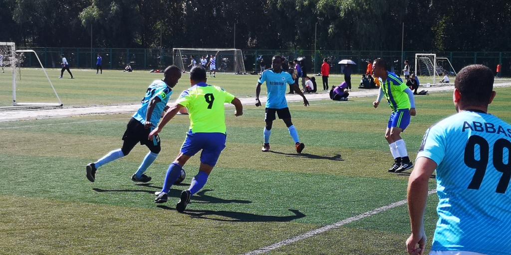 中午12时左右,双方参赛队员陆续到场。13时,比赛正式开始。比赛分上下半场,参加比赛的选手动作连贯、配合默契,实力不相上下。开场5分钟后,留学生队取得开门红,一脚远射敲开了对方的大门。但教工队也不甘示弱,在先失一球的情况下开始大举压上,在比赛20分钟后将比分扳平。比赛进入下半场,双方实力依旧不分伯仲,先后各进一球。最终,双方握手言和,以一场3:3的平局结束了比赛,但双方在场上的精彩表现、默契的配合,让现场观众为之喝彩。