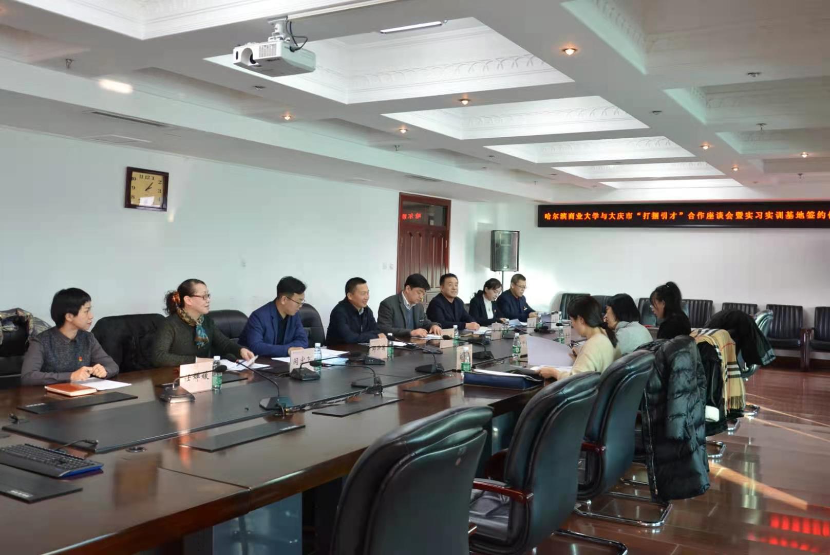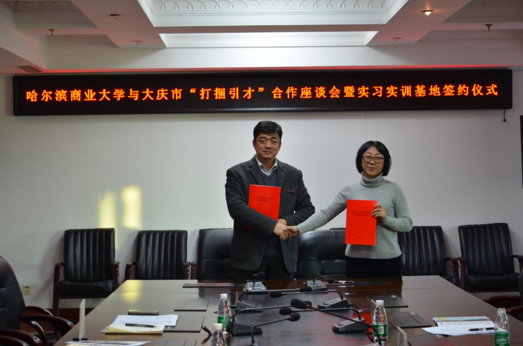 会上,赵清莉对大庆的发展状况及未来发展趋势进行介绍,并着重讲解大庆市委、市政府“十大基地”建设具体举措,希望与哈尔滨商业大学开展多方位合作。我校各相关部门与大庆市交流小分队在“实习实训基地”“就业创业基地”“高校科研成果转化基地”“人才智库基地”等基地建设方面展开交流。王巍、赵清莉代表双方签订实习实训基地协议。