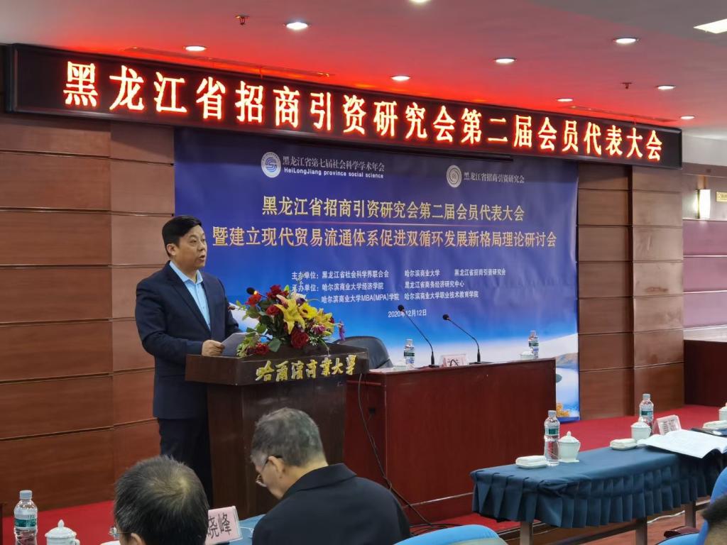 12月12日,黑龙江省招商引资研究会召开第二届会员代表大会暨建立现代贸易流通体系促进双循环发展新格局理论研讨会在我校召开。研讨会由黑龙江省社会科学界联合会、黑龙江省招商引资研究会和哈尔滨商业大学主办,黑龙江省商务经济研究中心和我校经济学院、MBA(MPA)学院、职业技术教育学院承办,会议采取线上线下相结合的方式进行,全程进行直播。黑龙省人民政府副秘书长李德喜、黑龙江省社会科学界联合会副主席刘幸、黑龙江省政府参事室特邀研究员叶晓峰、黑龙江省社会科学界联合会学会部部长曹妍、黑龙江省商业经济学会执行会长李彦春,哈尔滨市政协经济委员会副主任朱智、黑龙江省商务经济研究中心主任陈鸿鹏和我校党委书记孙先民出席大会;黑龙江省产权交易集团有限公司总经理王立峰、哈尔滨市国家投资项目评审中心处长仉立军,我校经济学院院长韩平、MBA(MPA)学院院长宋晓洪等莅临会场;黑龙江省商务经济研究中心,我校经济学院、职业技术教育学院、MBA(MPA)学院的专家学者及社会各界企事业单位人员共计200余人参会。李德喜副秘书长在参加此次会议期间莅临指导黑龙江省青年电商人才培训基地暨哈尔滨商业大学巴巴直播电商产业学院。