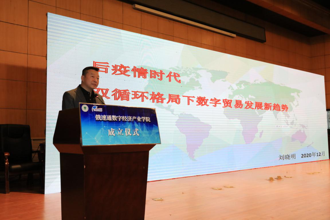 俄速通数字经济产业学院成立仪式后,俄速通集团总裁刘晓明博士为俄速通数字经济产业学院做第一场学术报告,题为“后疫情时代双循环格局下数字贸易发展新趋势”。