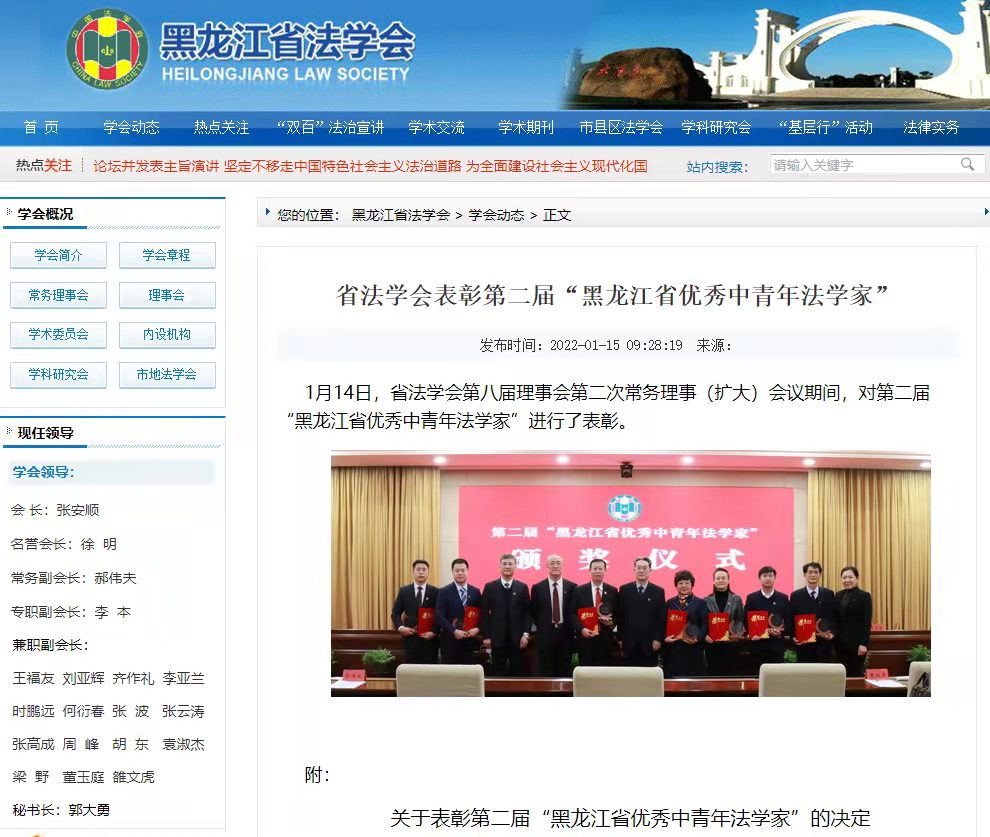 为响应中国法学会要求和我省学术界期待,培养和激励我省优秀法学人才,搭建优秀法学人才脱颖而出的平台,激励广大法学工作者、法律工作者坚持正确的政治方向、创新法学研究,深入学习和践行习近平法治思想,黑龙江省法学会组织开展了第二届“黑龙江省优秀中青年法学家”评选活动。经过广泛动员、民主推荐、集中评选、评选委员会终评、媒体公示,十名同志获评第二届“黑龙江省优秀中青年法学家”,我校法学院石贤平荣获第二届“黑龙江省优秀中青年法学专家”称号。近日,黑龙江省法学会第八届理事会第二次常务理事(扩大)会在哈尔滨召开,省委常委、政法委书记、省法学会会长张安顺出席会议并讲话。会上,对第二届“黑龙江省优秀中青年法学家”进行了表彰。