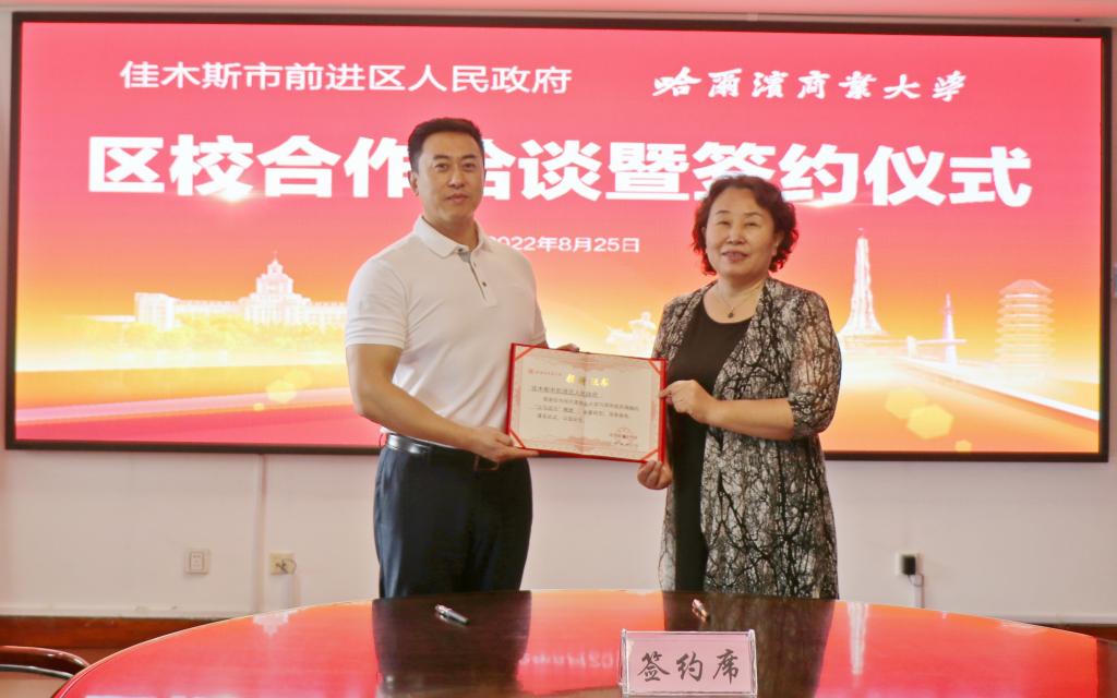 企业家学院负责人赵金梅与前进区区长徐永志代表双方签署区校战略合作协议。根据战略合作协议,双方将在产业发展、科研成果转化、电子商务平台运营、人才培养等方面开展深层次、全方位、实质性合作,建立长期合作伙伴关系。