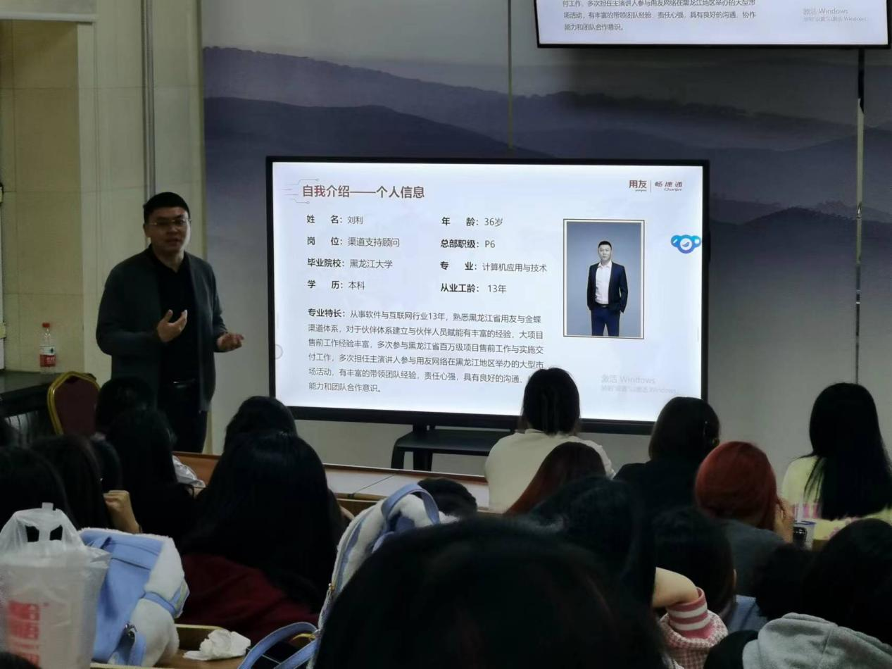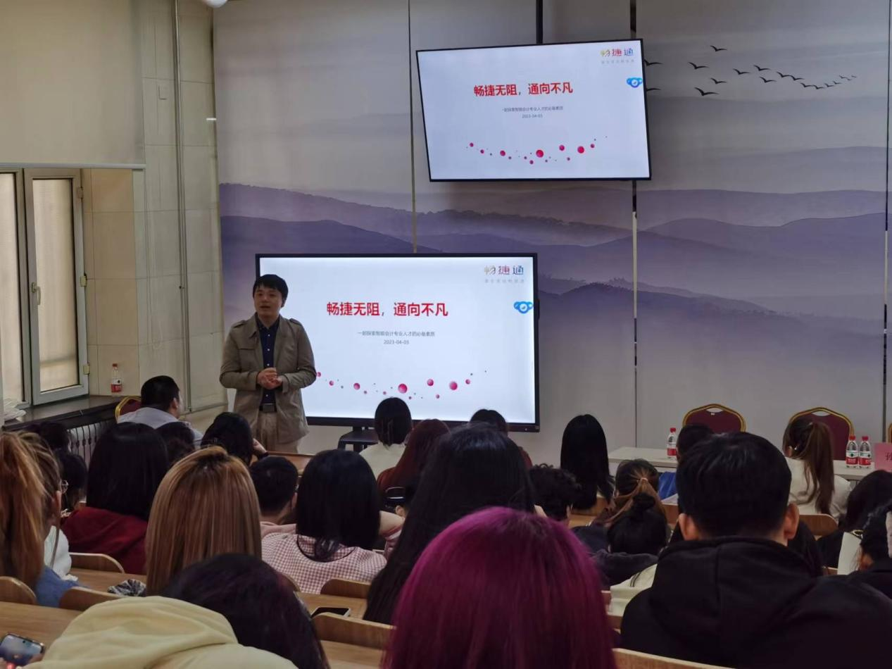 为落实“访企拓岗促就业”工作部署,持续推动产教融合、校企合作、协同育人,有效促进人才培养与社会需求紧密衔接,帮助学生了解职业岗位需求和规划职业生涯发展路径,4月3日下午,职业技术教育学院邀请用友畅捷通黑龙江省总经理孙馨在职教楼110室作“智能会计专业人才的必备素质暨用有畅捷通校招宣传”主题报告,渠道支持顾问刘利向同学们介绍《顾问岗位入门课程》。职业技术教育学院院长刘兴革、副院长周云峰、副处级辅导员乔祖强,用友新道培训教育黑龙江省服务商、黑龙江知为教育科技有限公司总经理董春辉,以及会计学专业各年级近百名同学参加讲座。