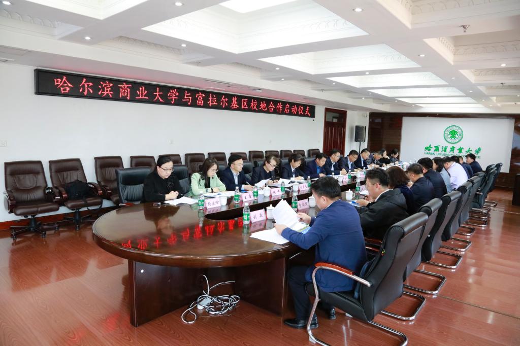 5月10日,哈尔滨商业大学与齐齐哈尔市富拉尔基区校地合作启动仪式在我校行政楼三楼会议室举行。我校校长郑秋鹛、副校长李景义;富拉尔基区委书记杨文波,富拉尔基区委常委、组织部部长张学民出席会议。富拉尔基区属优质企业代表,富拉尔基区委办公室、区发改工信科技局、区人才发展与服务中心,我校组织部、科研处、大学生就业创业指导中心、教务处、企业家学院、药学院、食品工程学院等相关单位领导和教师代表参加会议。李景义主持会议。