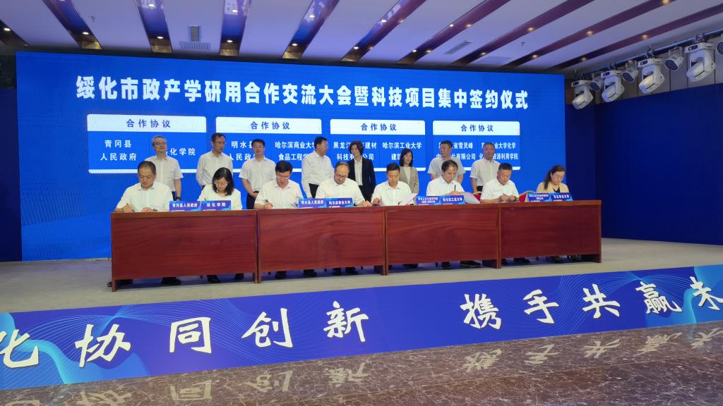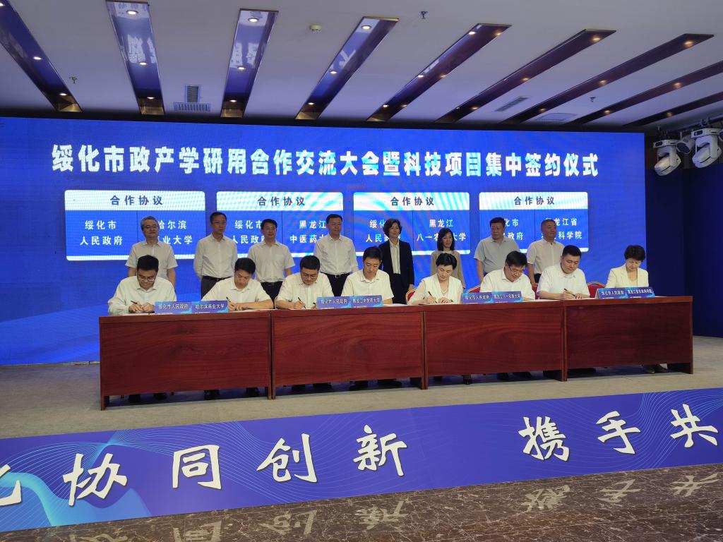 为进一步深化校地合作,深入实施创新驱动发展战略,加快科技成果转移转化,搭建校市合作平台,充分发挥我校学科专业优势,推动绥化市产业结构优化升级,加速产业链、创新链“双向融合”,近日,绥化市政产学研用合作交流大会暨科技项目集中签约仪式在绥化市召开。会上,我校与绥化市政府签署全面战略合作协议,我校副校长李景义出席会议并签署合作协议,绥化市明水县与我校食品工程学院签署明水县大豆深加工产业园区合作协议。绥化市委书记张宝伟,绥化市委副书记、市长孙飚,省科学技术厅党组成员、副厅长刘爱丽出席会议。哈尔滨工业大学、东北农业大学、黑龙江大学、黑龙江中医药大学、黑龙江省科学院等省内十余所高校院所及近200余家企业代表近350人参加会议。