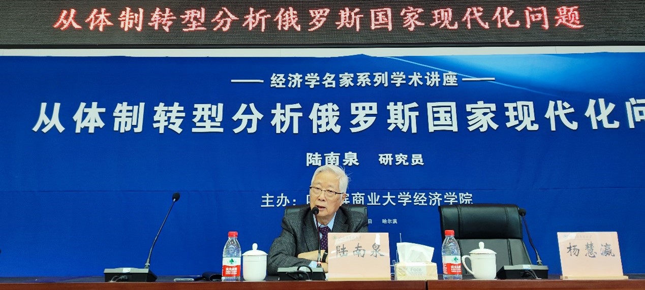 近日,哈尔滨商业大学经济学院经济学名家系列讲座活动在A区主楼1501室举行,中国社会科学院荣誉学部委员陆南泉教授受邀作了题为《从体制转型分析俄罗斯国家现代化问题》专题讲座。讲座由经济学院副院长杨慧瀛教授主持。经济学院、外语学院教师及学生代表190余人聆听讲座。