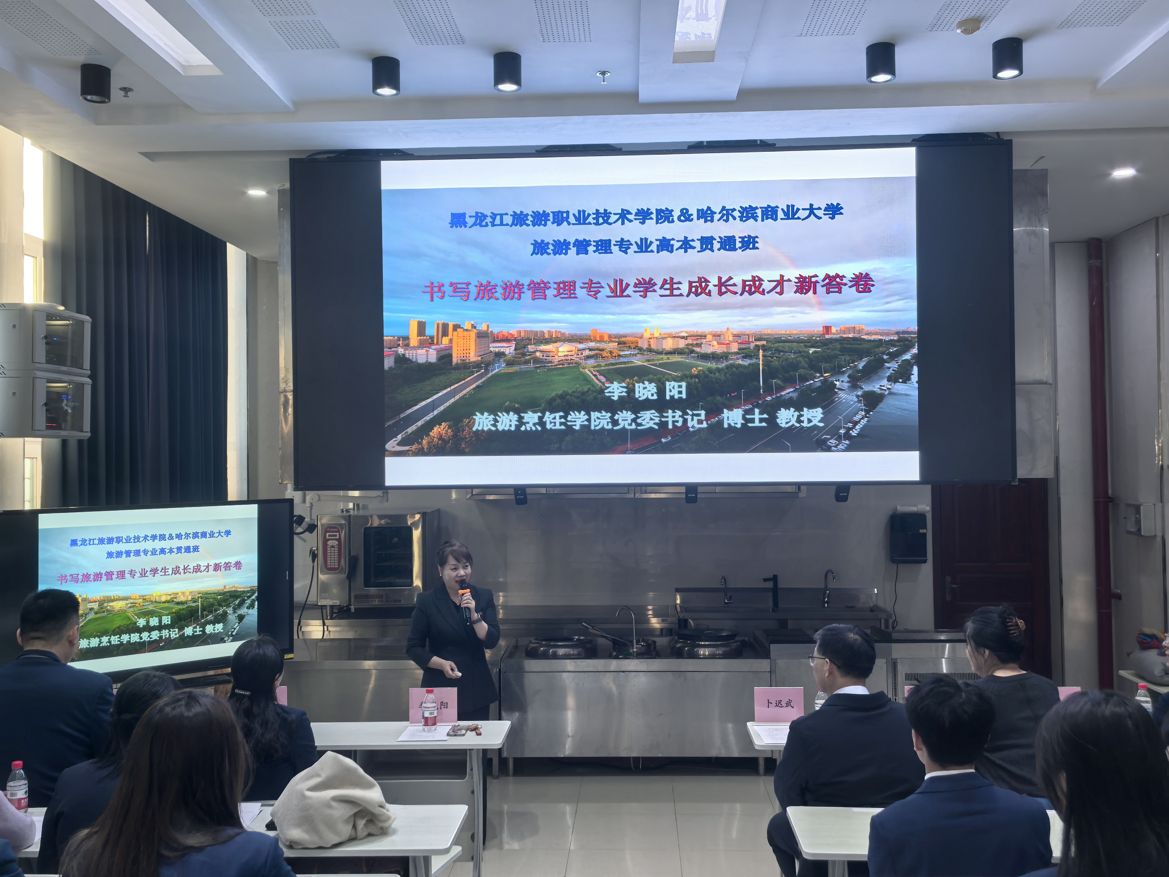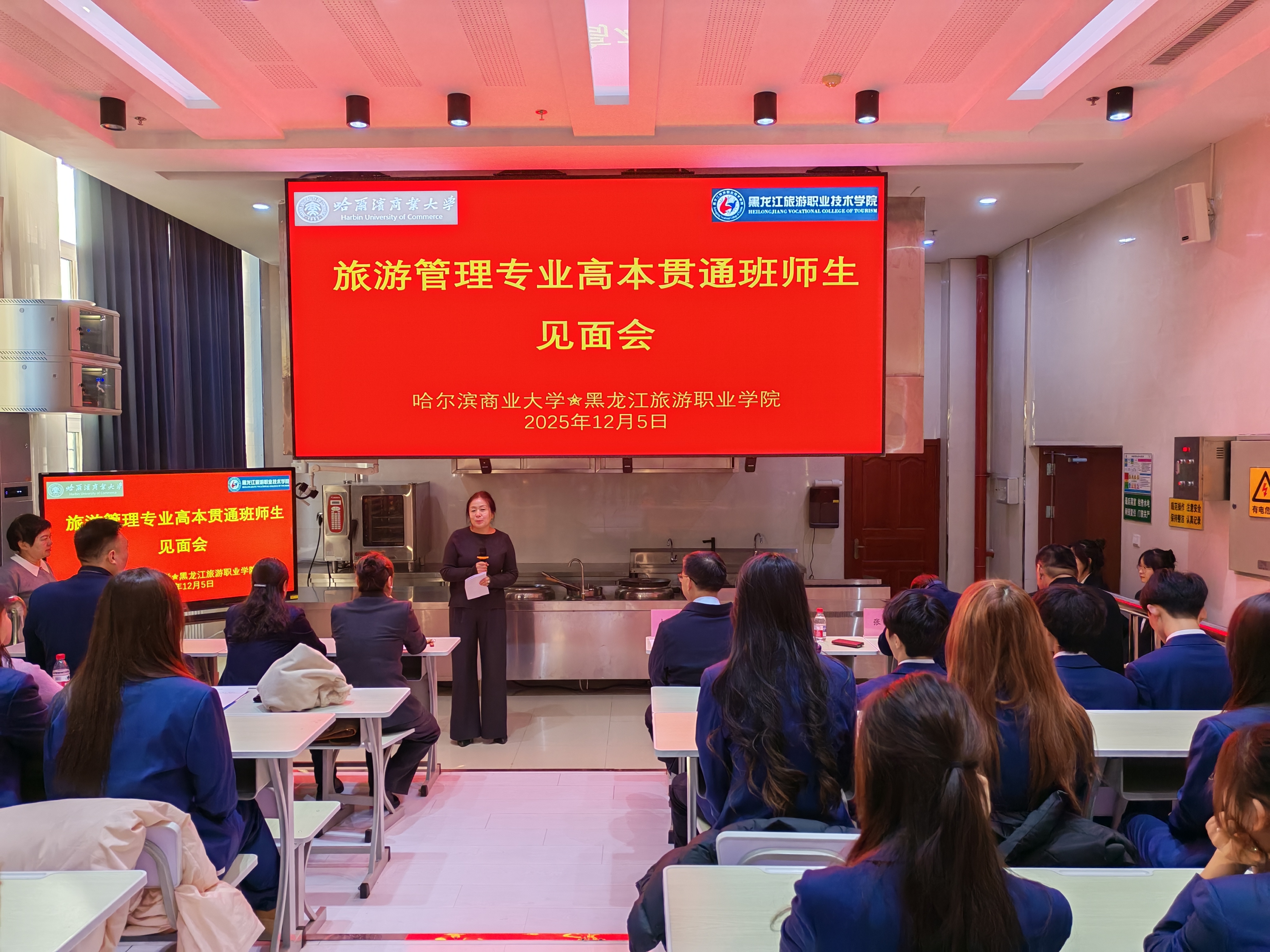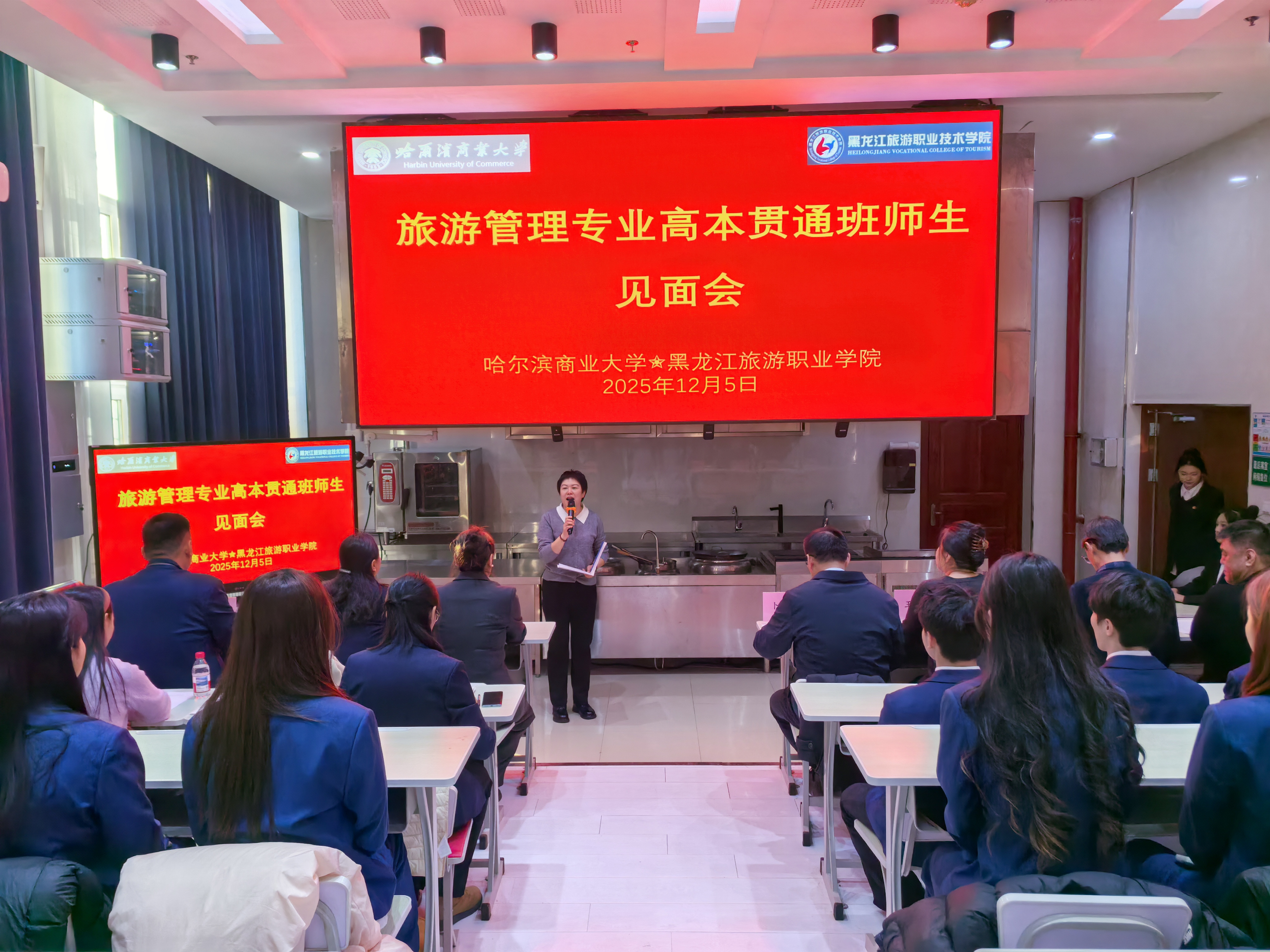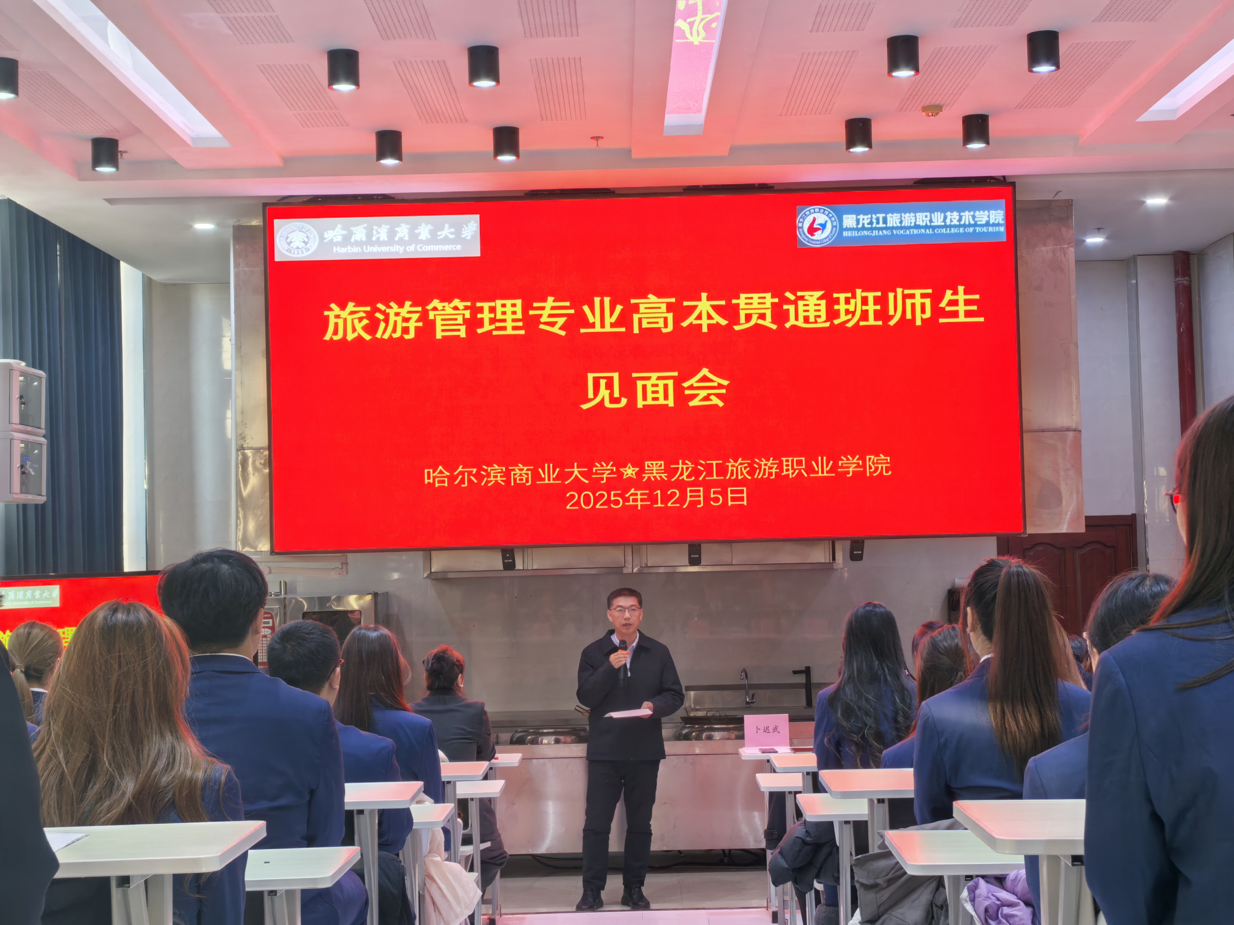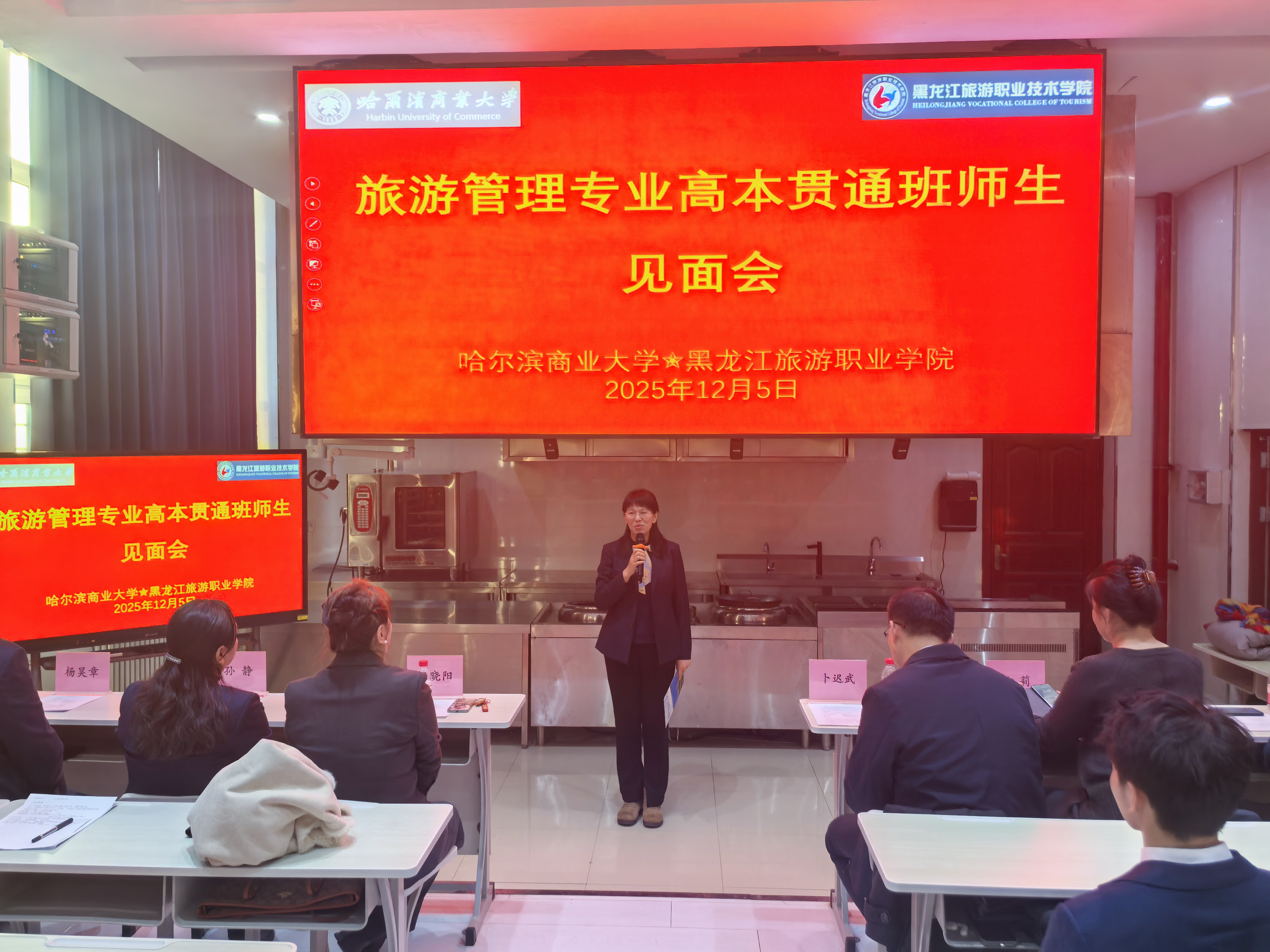 12月5日下午,哈尔滨商业大学旅游烹饪学院与黑龙江旅游职业技术学院联合举办的2025级旅游管理专业高本贯通班师生见面会在我校旅游烹饪学院0403教室召开。黑龙江旅游职业技术学院副校长王莉,旅游产业发展学院院长张恺、副院长赵甲申;哈尔滨商业大学教务处处长卜迟武,旅游烹饪学院党委书记李晓阳与党委副书记、院长孙静,副院长朱正杰;两校旅游专业带头人和骨干教师参加见面会。会议由朱正杰主持。
