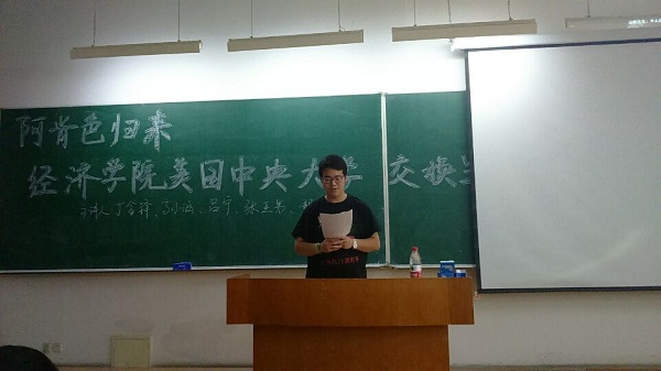 为推进我校本科教育和教育管理与国际高等教育接轨,我校于2014年10月在全校范围内选派10名同学赴美国中央阿肯色大学进行为期一学期的交换学习,经济学院5名优秀学生成功争取到这次宝贵的交流学习机会,经济学2013-2班邢泽玮同学被UCA选为全体国际交流生代表在结业典礼上致辞,获得一致好评,展示了商大学子的良好精神风貌。五名交换生以优异学习成绩完成学业,顺利返校,5月29日,我院及时组织了“美国中央阿肯色大学归来——经济学院赴美交换生交流分享会”,让全院学生通过他们打开的一扇窗,领略美国高等教育的风采。