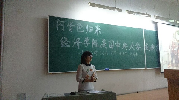 5月29日下午5时,赴美国中央阿肯色大学交换生交流分享会正式开始。2013级辅导员姚春燕老师主持交流分享会,五位主讲人分别是13级经济统计2班丁金铎,13级国际经济与贸易2班高小涵,13级国际经济与贸易1班吕宁、张亚男,13级经济学2班邢泽玮。他们从不同的方面介绍了自己在美国学习生活5个月的经历、收获与感受。