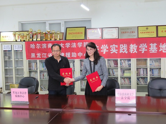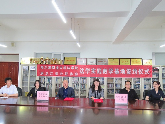 培养应用型、复合型法律职业人才是实施卓越法律人才教育培养计划的重点。为进一步落实《教育部 中央政法委员会关于实施卓越法律人才教育培养计划的若干意见》(教高〔2011〕10号)精神,本着适应多样化法治人才要求,强化学生法律实务技能培养,提高学生运用法学与其他学科知识方法解决实际法律问题的能力,促进法学教育与法律职业的深度衔接。6月6日上午,法学院石晶玉院长与省司法厅公证管理处(省公证协会)姜文臣处长、黑龙江省法律援助中心刘智勇主任、哈尔滨公证处关艳红副主任分别签订了“法学实践教学基地共建协议”。出席本次活动的嘉宾还有黑龙江省司法厅司法考试处于洪波处长、省司法厅公证管理处副处长邹涛,以及省、市、区公证处的公证员,法学院副书记高勇副教授、法援工作部部长石贤平副教授以及法援工作部的学生们也参加了本次活动。