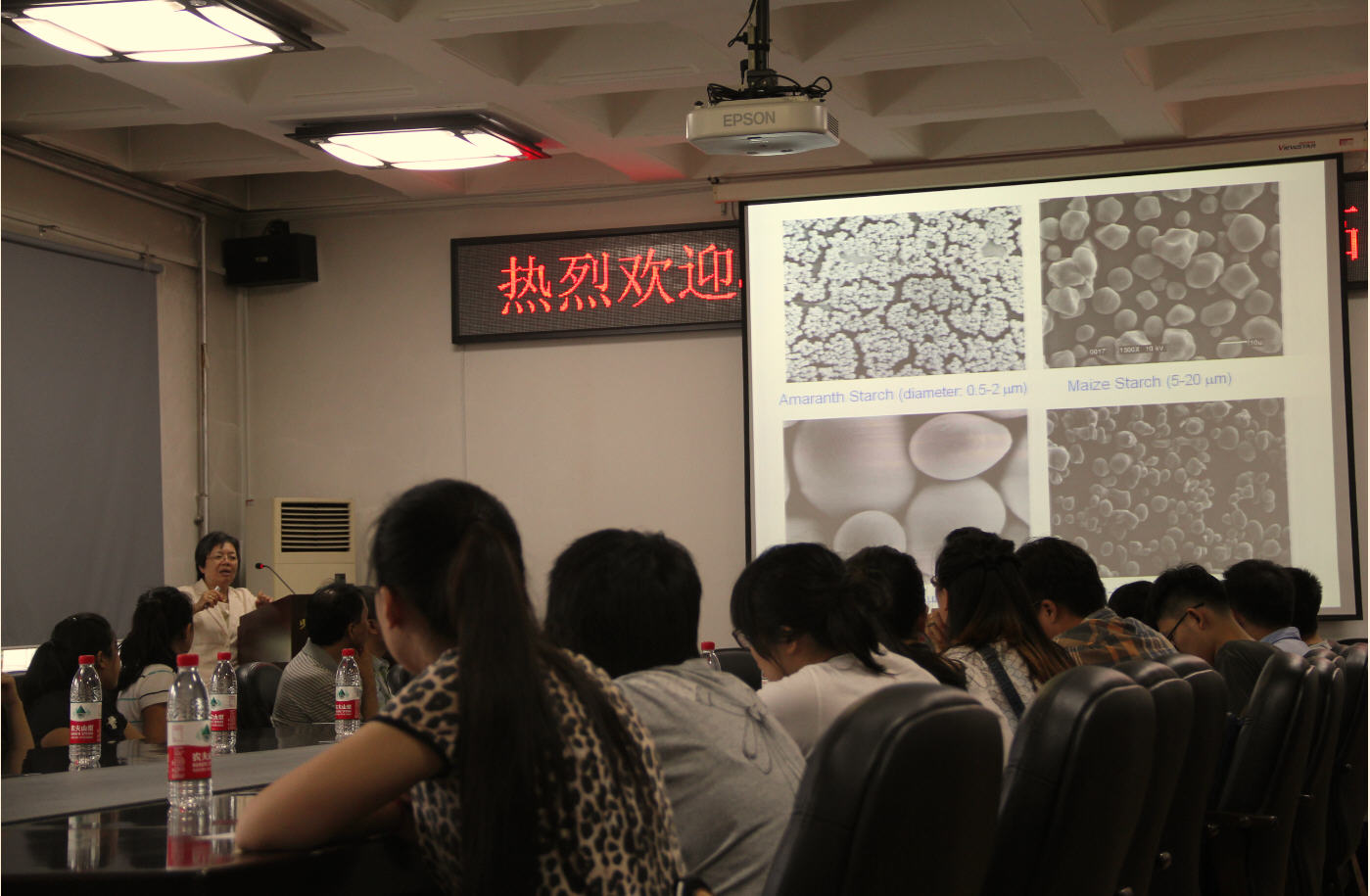 Jay-lin Jane教授与我院的广大师生交流了其在谷物化学、碳水化合物与生物可降解高分子材料等研究方面取得的大量原创性成果。淀粉颗粒化学与物理结构专题详细阐述了淀粉颗粒内部分子链的构成及其与颗粒降解特性的关系;淀粉结构分析专题侧重阐述了显微分析技术、热分析技术及分子质量及结构分析技术在淀粉中的应用;抗性淀粉与人体健康专题则详细阐述了抗性淀粉的制备、性质及其消化特性,同时,介绍了体外及体内试验对抗性淀粉保健功能的评价。通过三个专题“淀粉颗粒的化学与物理结构”、“淀粉结构分析技术”、“抗性淀粉与人体健康”,Jane教授将淀粉的来源、理化性质,从研发的热点、到淀粉和人体健康的关系等等方面进行了深入浅出的分析,开阔了师生的视野。