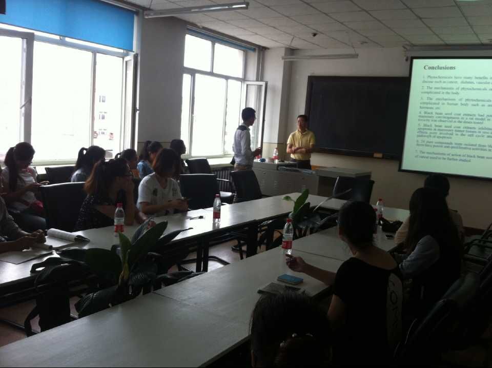 刘佳仁博士首先就植物化合物的分类、代谢、解毒及健康效应等问题为大家进行了生动地介绍。同时,结合他在哈佛大学课题组的研究案例及科研数据,以黑豆皮多酚为例系统地阐述了黑豆皮多酚预防肿瘤发生的作用及作用机制。最后,刘博士与在场的师生进行了热烈的互动问答,交流涉及到“如何设计实验”、“如何建立测定抗氧化活性方法”等,大家被刘佳仁博士敏捷的思维、富有感染力的讲解所吸引。