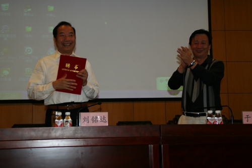 副校长于树彬教授向刘铭达教授颁哈尔滨商业大学发客座教授聘书