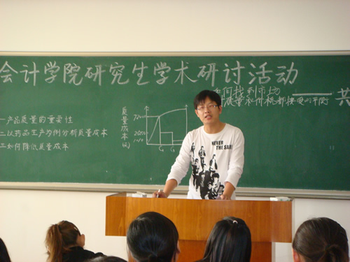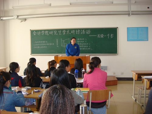 为激发研究生读书热情,提升研究生自主学习能力,在副院长张劲松教授的积极倡导下,10月21日下午1:30分,会计学院举办了首届“共读一本书——研究生学术交流会”。本次活动由张劲松教授主持,会计学院教师、08级全体研究生及部分07级研究生参加了交流会。