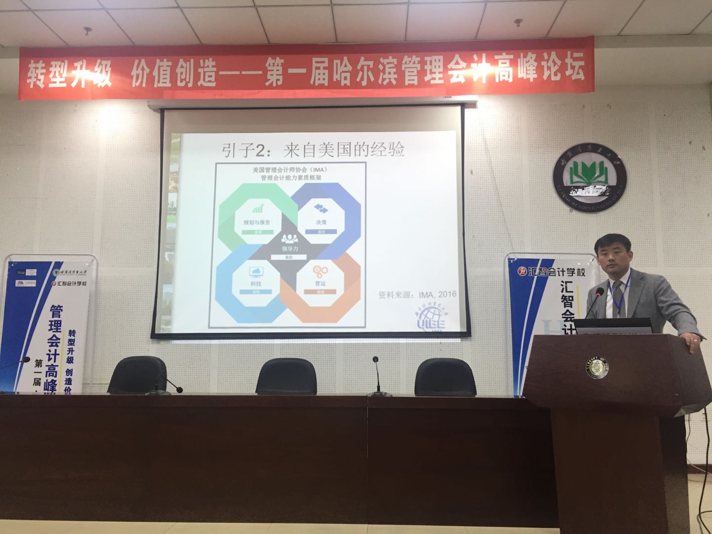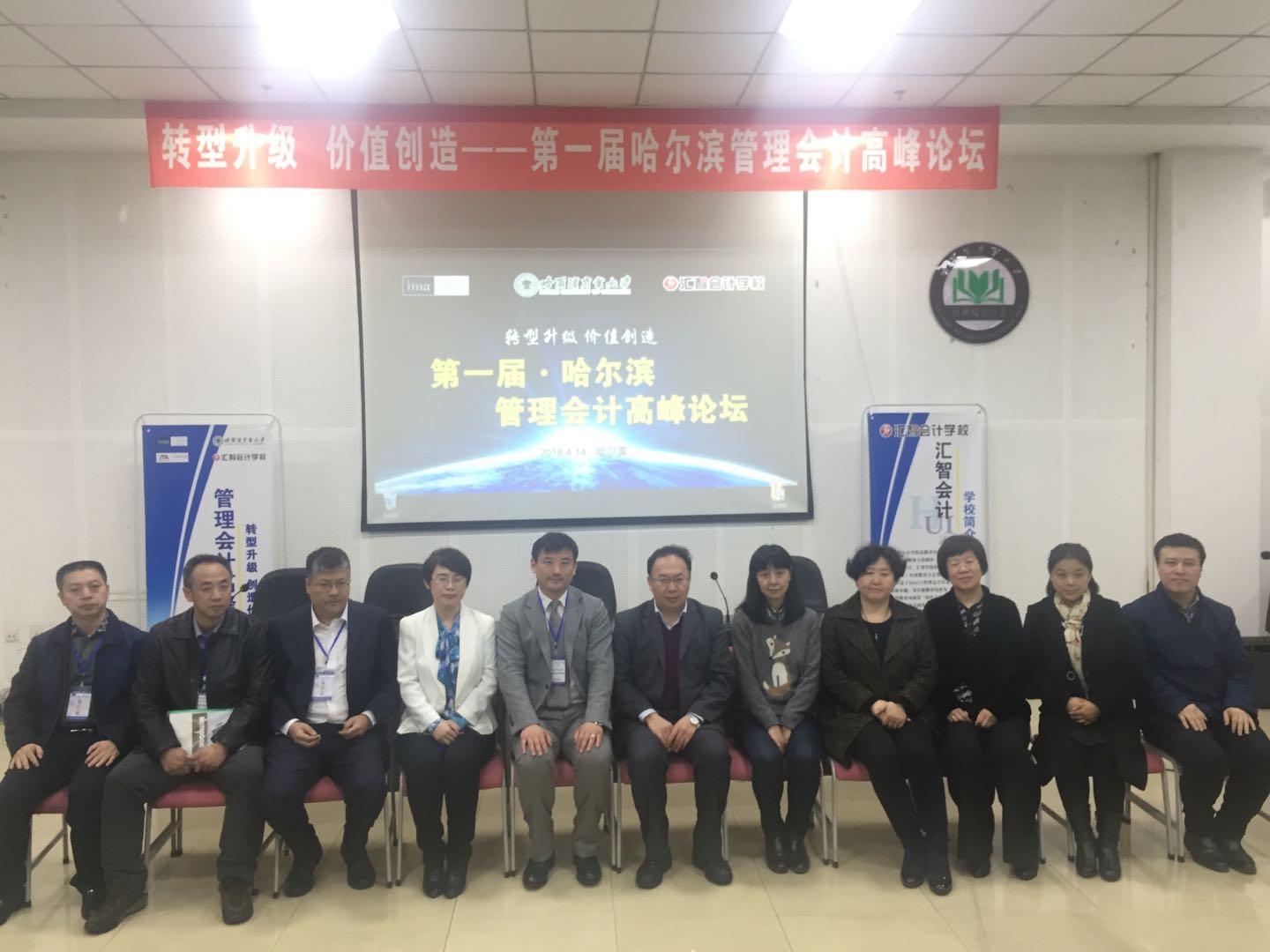 2018年4月14日下午,由美国管理会计师协会中国教育分会、哈尔滨商业大学、哈尔滨汇智学校联合主办的“转型升级、价值创造——第一届哈尔滨管理会计高峰论坛”在我校召开。论坛邀请了IMA全球董事浦军教授、哈尔滨商业大学会计学院院长张林教授、会计学院副院长张劲松教授、会计学院博士生导师周航教授和来自企业的10余位代表,这些代表为浦发银行哈尔滨分行资产保全部总经理寇承洪先生、中国移动哈尔滨分公司财务部经理徐玲女士、黑龙江辰能投资管理有限公司副总经理周鲁宝先生等。此外,哈尔滨商业大学、哈尔滨金融学院、黑龙江外国语学院、黑龙江财经学院学生及教师也参加了本次论坛。