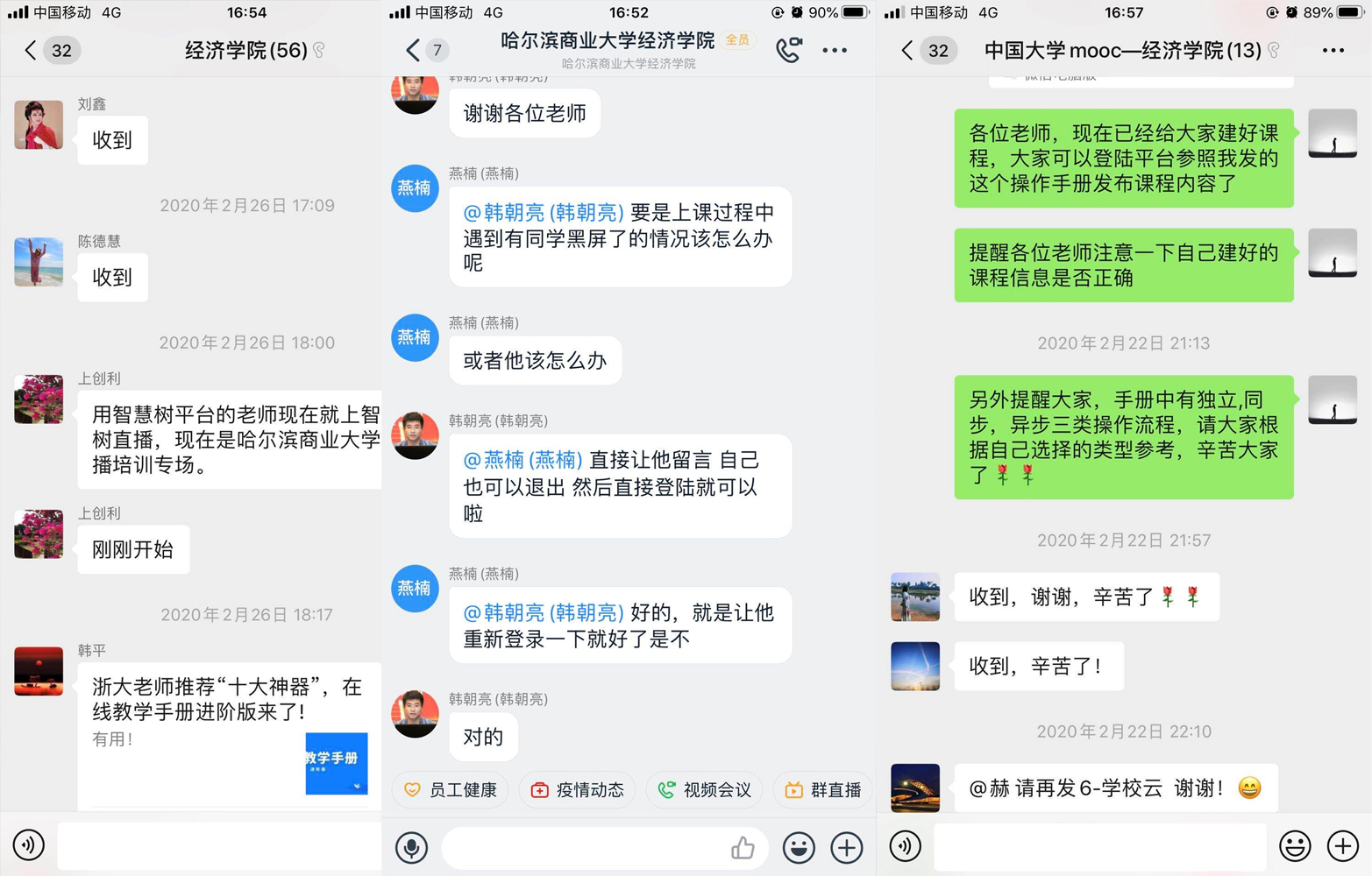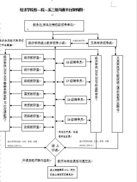 目前经济学院已经搭建好完整的校—院—系三级沟通平台,同时响应学校疫情期间的号召,实现全院线上办公,保证畅通的学生、教师、院系沟通反馈闭环,确保经济学院2019-2020春季学期本科教学课程线上授课覆盖率达到97%。从最初的学院组织安排教师熟悉网络教学平台,学习使用教学软件;到中期教研室内部搜集各方面资源,丰富课程共享资料;再到院系两级确定上课平台,集体探讨网络课;最后教师与授课班级建立联系,准备授课预案。