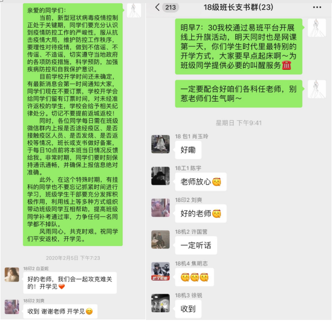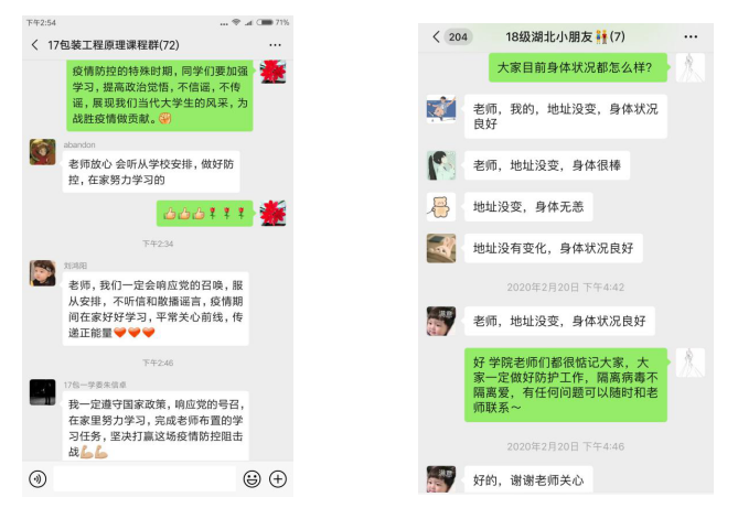 2.课程融入:开课以来教师们因时而进、因势而新、因事而化,将疫情作为教材,将融入思政元素的感人事迹传递给学生。同时在授课过程中不忘对同学们真挚关怀和殷殷教导,主动了解同学们近期的学习生活状况,鼓励同学们调整放松心态;积极普及疫情防控科学知识,严格遵守疫情防控要求;教育学生保持理性,学会独立思考,不信谣、不传谣、不造谣;隔离病毒,不隔离爱,直播有温度的课堂,做同学们健康成长的引路人。