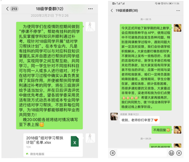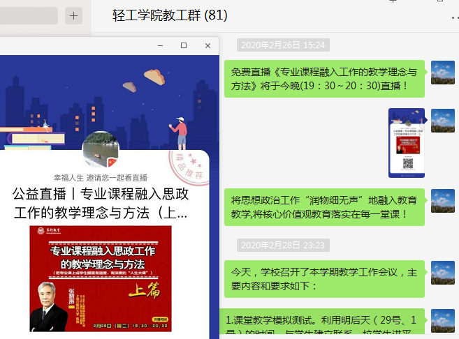 3.开会交流:召开了全院教师视频工作会议,传达学校教学工作会议精神,布置学院近期工作,成立疫情防控领导小组。各专业进行教研室讨论,交流软件操作技巧,授课模式,制定授课计划和线上教学授课大纲。教学秘书搭建关键桥梁,及时发布信息、沟通解决师生问题。