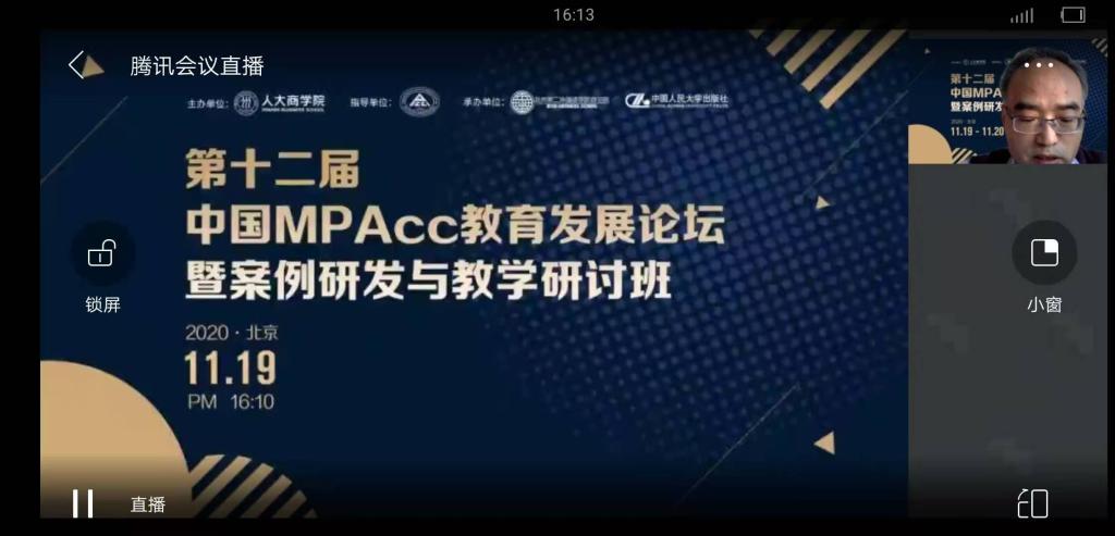 11月19日至20日,会计学院组织硕士研究生导师和2019级学硕、2020级全体研究生在1405、1501、1517在线观看第六届中国社会科学案例论坛暨案例研发与教学研讨班讲座。中国人民大学原副校长、中国社会科学案例中心主任伊志宏教授主持讲座,邀请中国人民大学副校长刘元春教授、中国人民大学商学院院长毛基业教授致欢迎辞,会计教育指导委员会副主任兼秘书长王化成教授致开幕辞。