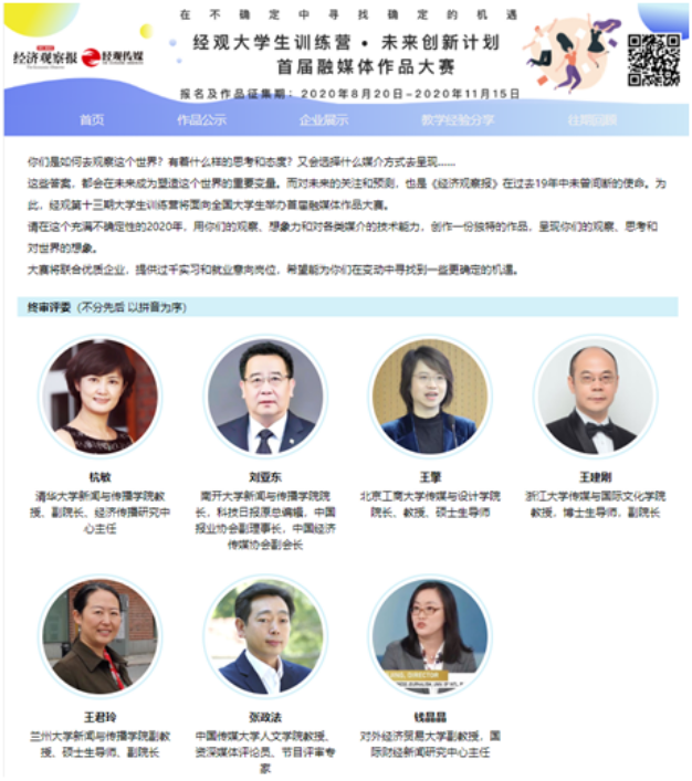 经观大学生训练营——未来创新计划暨首届融媒体作品大赛由《经济观察报》主办,作为全国三大经济类报刊之一,《经济观察报》是中国新生的学术、商业和舆论领袖交流与对话的平台。经观大学生训练营已举办十三届,以培养复合应用型创新媒体人才为目标,同步进行专家讲座、企业走访、教学经验交流等活动。本次大赛得到了清华大学新闻与传播学院经济传播研究中心、对外经济贸易大学企业与战略研究所产业创新研究中心等高校的学术支持,同时也有来自中国经济网、环球网、中新经纬、每日经济新闻、21世纪经济报道等财经媒体的支持。