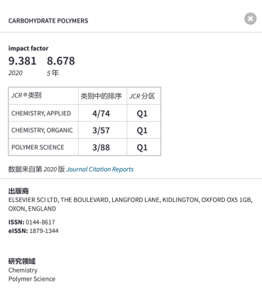 《Carbohydrate Polymers》1981年创刊,Elsevier出版,由SCI收录的JCR、CiteScore一区期刊,2020年影响因子为9.381,近5年平均影响因子为8.678。该刊在JCR应用化学领域期刊排位4/74(Q1)、有机化学领域期刊排位3/57(Q1)、高分子科学领域期刊排位3/88(Q1)。2021年Elsevier发布的CiteScore评分达13.40。