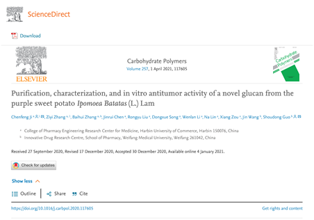 哈尔滨商业大学药学院(药物工程技术研究中心)药效物质基础创新团队汲晨锋研究员在化学专业领域中科院一区TOP期刊《Carbohydrate Polymers》发表研究成果“Purification, characterization, and in vitro antitumor activity of a novel glucan from the purple sweet potatoIpomoea Batatas(L.) Lam.”。课题组基于药食同源理论开展了紫甘薯药效物质基础的相关研究。完成了紫甘薯多糖多级分的制备,并通过物理和化学方法结合UV、FT-IR、RAMAN、GPC、HPLC、GC-MS、NMR、TGA、DSC、X-RAY、CD、AFM、SEM等高等仪器全面系统地分析了紫甘薯多糖的初级、高级结构特征,为课题后续活性研究工作及构效关系理论研究奠定基础。本研究工作得到了黑龙江省自然科学基金项目、黑龙江省博士后特别资助项目支持。