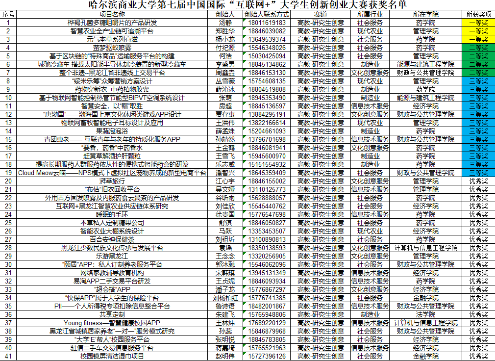 按照省教育厅相关文件要求,本届大赛我校进入黑龙江赛区复赛的项目共66项,其中主赛道52项、红旅赛道12项、职教赛道2项。我校择优推荐了3个赛道,以“共和国的笔杆子——二次元视角下的我国制笔工业发展历程”为代表的社会服务项目、以“冰雪娱乐双足机器人”为代表的制造业项目、以“FA---无抗饲料块”为代表的现代农业项目、以“迅鹰科技”为代表的信息技术服务项目、以“风吹麦浪——艺起传非遗”为代表的文化创业服务项目等5个行业的优秀项目进入省赛复赛。学校将继续提升“互联网+”入围项目质量,做好省赛、国赛等相关赛事工作。