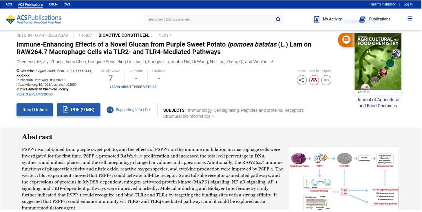 2021年8月,哈尔滨商业大学药学院(药物工程技术研究中心)药效物质基础创新团队汲晨锋研究员在农林科学领域中科院一区TOP期刊《Journal of Agricultural and Food Chemistry》发表研究论文“Immune-Enhancing Effects of a Novel Glucan from Purple Sweet PotatoIpomoea Batatas(L.) Lamon RAW264.7 Macrophage Cells via TLR2- and TLR4-Mediated Pathways”(一种新型紫甘薯葡聚糖通过Toll样受体2/4介导途径增强巨噬细胞RAW264.7免疫功能),这是该团队继2021年4月在中科院一区TOP期刊《Carbohydrate Polymers》发表研究论文“Purification, characterization, and in vitro antitumor activity of a novel glucan from the purple sweet potatoIpomoea Batatas(L.) Lam.”(一种新型紫甘薯葡聚糖的纯化、表征及抗肿瘤活性研究)后,取得的又一个重要科研成果。哈尔滨商业大学为该研究成果唯一署名单位,李文兰教授、汲晨锋研究员为本文共同通讯作者。