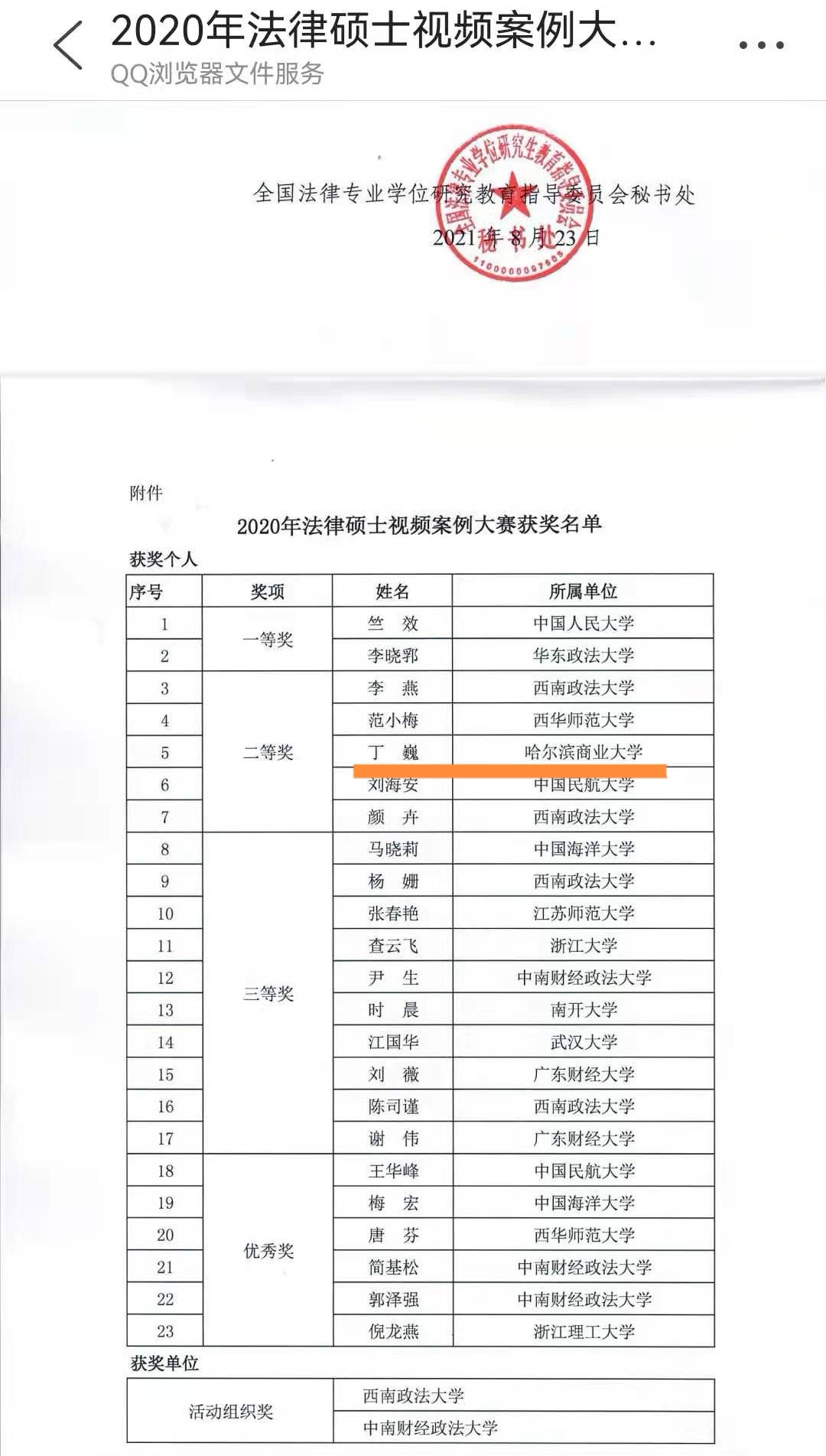 8月23日,全国法律专业学位研究生教育委员会秘书处公布了2020年法律硕士视频案例大赛获奖名单,我校法学院丁巍博士的视频案例继文字案例入库后,视频案例再次入库并荣获二等奖。此次视频案例大赛中,丁巍博士的表现凸显其对法律实践勇于探索、不断创新的能力及全面发展的个人风采,也为我校法律硕士师资队伍增光添彩。