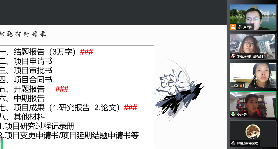 为做好2019-2020年度学院大学生创新创业训练计划项目结题工作,更好的将创新创业教育融入学院人才培养之中,营造良好的创新创业氛围。近日,经济学院以“挖掘CNKI应用,助力创新创业”为主题,在线举办经济学院大学生创新创业项目专题辅导讲座。学院2019级学生贾国荣和2018级学生夏永奇分别作CNKI应用和大学生创新创业项目结题经验分享。学院2019级、2020级大创项目负责人和项目成员参加讲座。