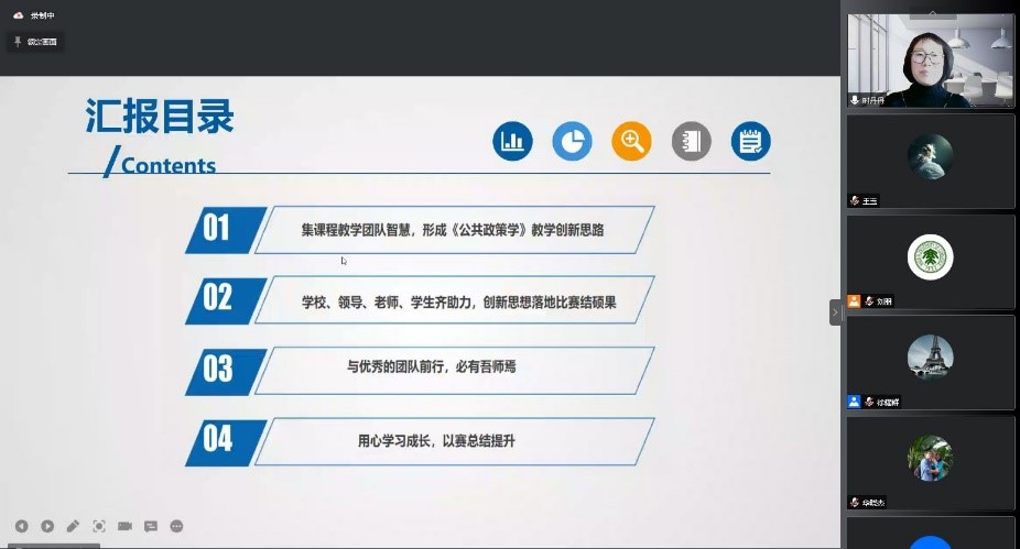 财政与公共管理学院教师时丹丹是我校首届高校教师教学创新大赛副高组一等奖获得者,她以“以生为本,德能驱动——《公共政策学》课程教师教学创新分享”为题,分享了《公共政策学》课程教学的创新思路与具体创新经验、课程创新思想落地取得的成果、课程团队在教学创新中的作用和以赛促教的意义,为专业课程的教学创新设计提供了借鉴思路。