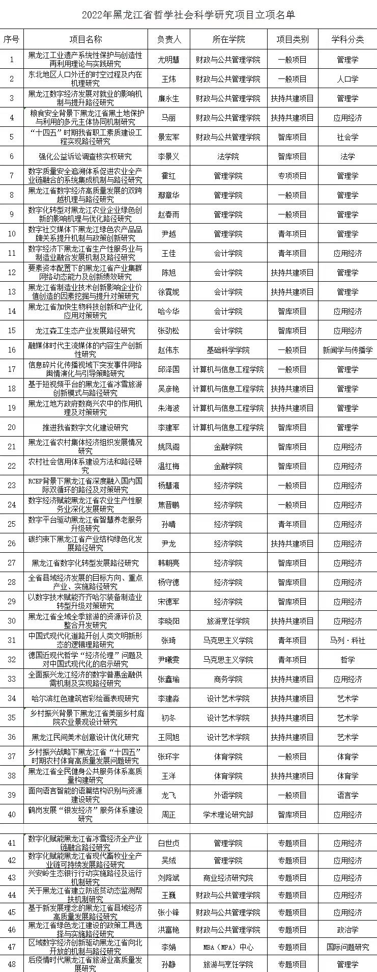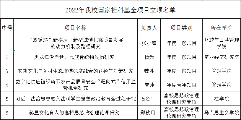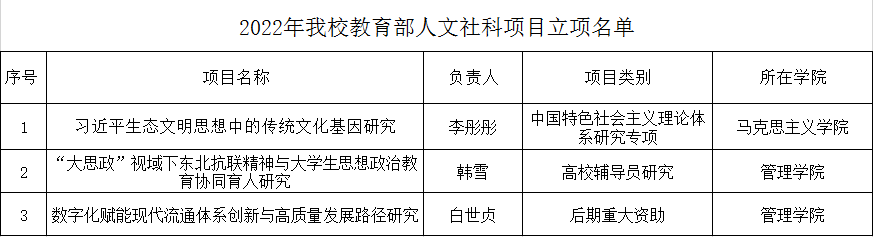 近日,我校哲学社会科学研究项目捷报频传,先后获批教育部人文社科项目3项,国家社科基金高校思想政治理论课研究专项2项,黑龙江省哲学社会科学研究规划项目40项。其中,教育部后期资助重大项目的立项,实现了我校在哲学社会科学领域重大项目零的突破,也是本年度获批该项目立项中黑龙江省乃至东三省唯一的1项。国家社科基金高校思想政治理论课研究专项我省共立项4项,我校获批2项,充分体现了我校深入贯彻落实习近平总书记在学校思政课教师座谈会上的重要讲话精神,在积极推动思想政治建设工作方面取得了重要推进。