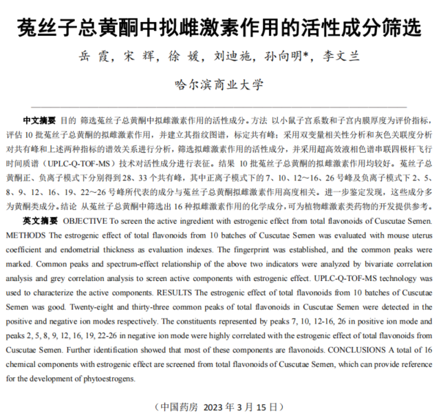 此次国创年会设置了大学生创新学术交流、大学生创业项目推介、大学生创新创业改革成果项目展示等活动。其中,从部属高校和地方高校共遴选学术论文200篇进行学术交流。经过学校推荐,黑龙江省教育厅遴选,“国创计划”专家工作组复选,我校由药学院2020级制药工程专业学生岳霞主持、教师孙向明指导的2022年国家级大学生创新创业训练计划项目成果《菟丝子总黄酮中拟雌激素作用的活性成分筛选》入选年会交流论文。