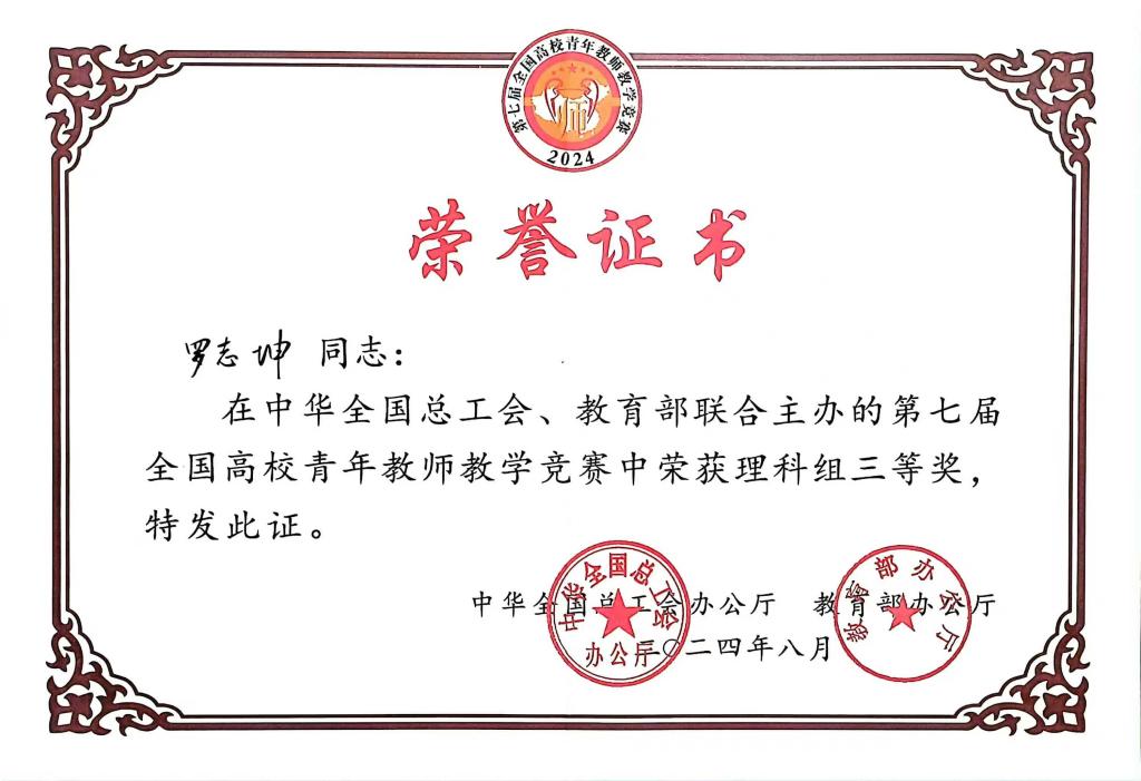 8月30日,由中华全国总工会、教育部联合主办,中国教科文卫体工会、教育部教师工作司联合承办的第七届全国高校青年教师教学竞赛决赛在上海交通大学落下帷幕,我校基础科学学院教师罗志坤以省赛理科组第一名成绩跻身国赛,经过2天的激烈角逐,以理科组全国第17名成绩喜获全国高校青年教师教学竞赛三等奖。