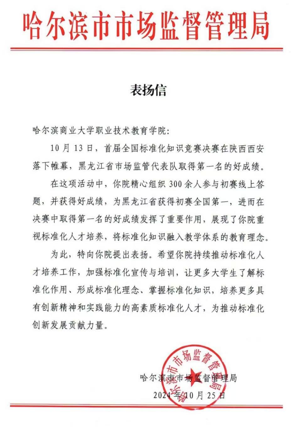 在全院师生的共同努力下,学院学生在首届全国标准化知识竞赛中取得了优异成绩,为黑龙江省代表队斩获全国第一名作出了重要贡献。这一成绩的取得,不仅展示了我校职业技术教育学院学生的专业素养和团队协作能力,提升了学院的知名度和影响力,同时进一步加强了政校合作交流。为表彰哈尔滨商业大学职业技术教育学院在竞赛中的优秀组织工作和突出贡献,哈尔滨市市场监督管理局向学院发来一封表扬信,对学院的辛勤付出和取得的优异成绩给予了高度肯定和赞扬。