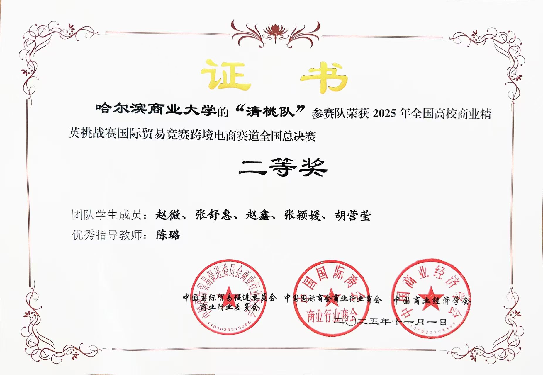 近日,全国高校商业精英挑战赛组委会传来喜讯。在外语学院教师陈璐的悉心指导下,由2022级商务英语专业学生赵微、张舒惠、胡营莹与2024级商务英语专业学生赵鑫、张颖媛5名学生组成的参赛团队,在全国高校商业精英挑战赛国际贸易竞赛(跨境电商赛道)中表现优异,最终荣获全国二等奖,展现了外语学院学子扎实的专业素养与卓越的实践创新能力。