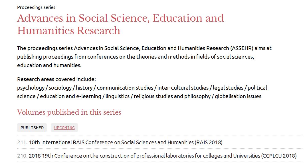 出版社出版计划网址:https://www.atlantis-press.com/proceedings/series/assehr,点击UPCOMING,第210条