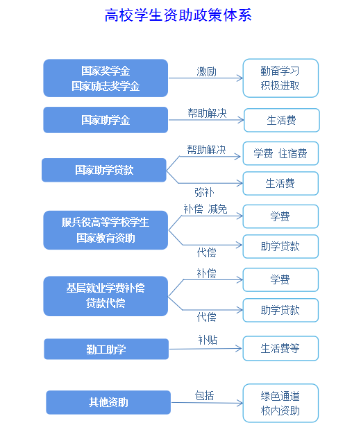 国家在高等教育本专科阶段建立起国家奖学金、国家励志奖学金、国家助学金、国家助学贷款等多种形式有机结合的高校学生资助政策体系。