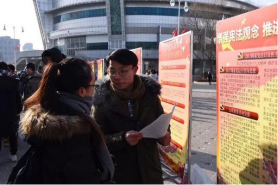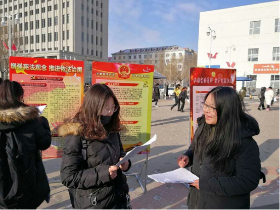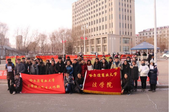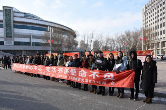为进一步学习贯彻党的十九大精神,维护宪法权威,积极响应中宣部、司法部、全国普法办关于开展2017年“12.4”国家宪法日系列普法活动的通知,由校学工部(处)主办,法学院团委、哈尔滨商业大学法援工作部共同承办的“学宪法 讲宪法”主题宣讲活动,于2017年12月4日上午在校园A区食堂前圆满完成。法援工作部部长石贤平,法学院团委书记李萍,2017级辅导员崔季出席活动,法援工作部执行部长李伟,法学会各部部长及部员共40余人参加了活动。