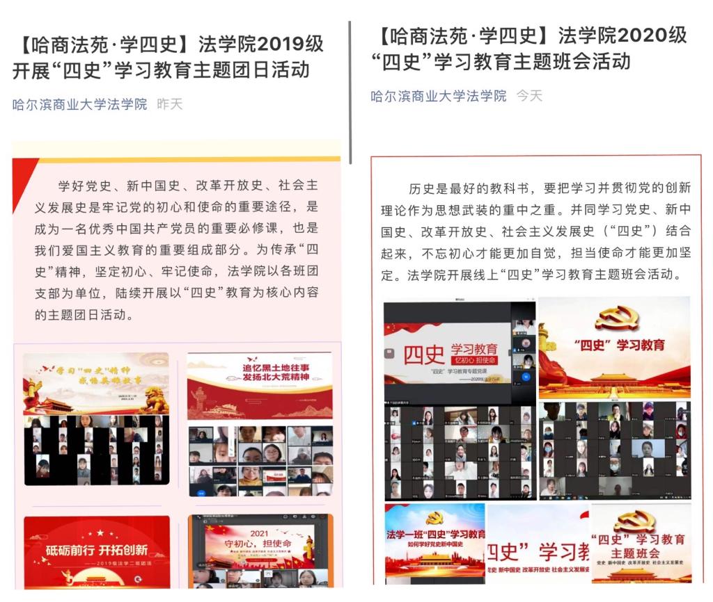 为深入学好党史、新中国史、改革开放史、社会主义发展史,增强青年学生历史使命感和时代责任感,法学院党委依托哈商法苑微信公众号,不断创新内容形式,灵活运用各种载体,组织开展“学‘四史’·传承红色基因”线上主题系列活动。主要包括:法苑昕声“四史”特辑、漫画“四史”、线上“四史”学习教育主题团日及班会活动、观看“四史”学习教育网络直播课、线上竞答争先活动等,做到有声有色讲好“四史”故事,入脑入心弘扬“四史”精神。