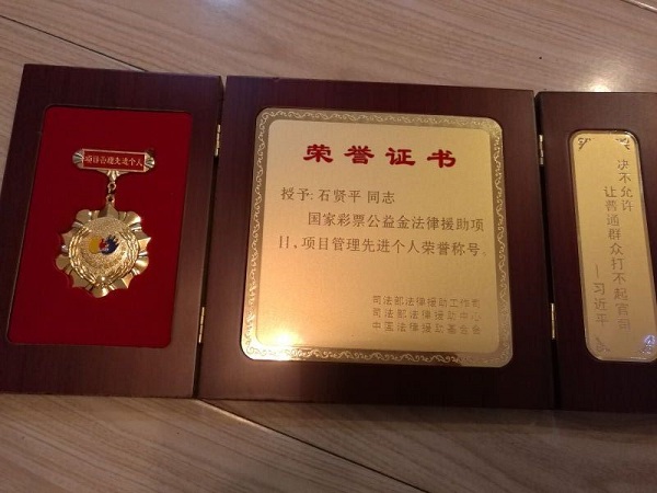 2016年12月7日,司法部法律援助工作司、司法部法律援助中心、中国法律援助基金会在北京召开中央专项彩票公益金法律援助项目总结部署工作会议,对“十二五”期间表现突出的先进集体和个人进行表彰。司法部副部长赵大程,中华全国妇女联合会书记处书记谭琳,中国法律援助基金会理事长张彦珍出席会议,并为受到表彰的项目示范单位、项目管理先进个人代表颁奖。我校法援工作部部长石贤平副教授受到表彰,荣获“十二五”期间中央专项彩票公益金法律援助项目管理先进个人荣誉称号。
