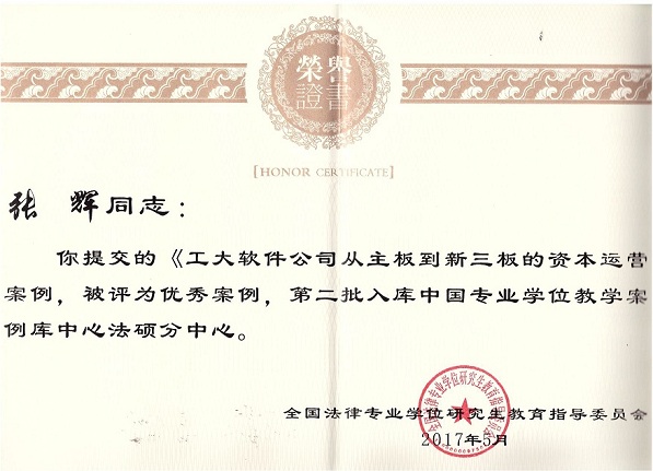 哈商大法学院2015年招收专业硕士研究生以来,极其重视中国专业学位教学案例中心的案例征集工作,召开会议、修订法学院的科研奖励办法,积极鼓励、支持法学专任教师撰写案例。在第二批法学案例征集工作中,经法学专业教指委组织专家严格评审,法学院张辉老师提交的非诉讼实务案例《工大软件公司从主板到新三板的资本运营》从所征集到的113个法学教学案例中脱颖而出,入选案例库,并于2017年5月被评选为优秀案例,受到表彰。